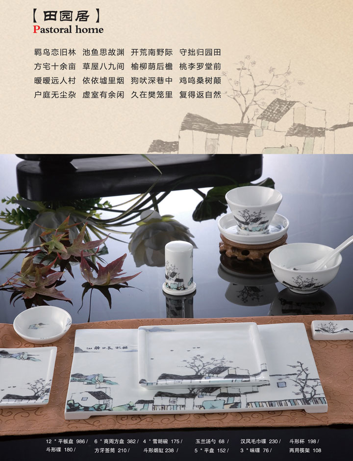 12寸平板盘、6寸商周方盘、4寸雪朗碗、玉兰汤勺、汉风毛巾碟、斗形杯、斗形碟、方牙签筒、斗形烟缸、5寸平盘、3寸味碟、两用筷架。