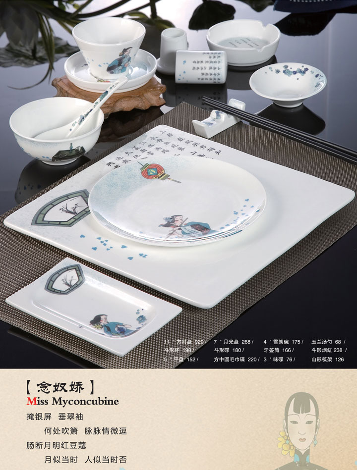 11寸方衬盘、7寸月光盘、4寸雪朗碗、玉兰汤勺、斗形杯、斗形碟、牙签筒、斗形烟缸、5寸平盘、方中圆毛巾碟、3寸味碟、山形筷架。