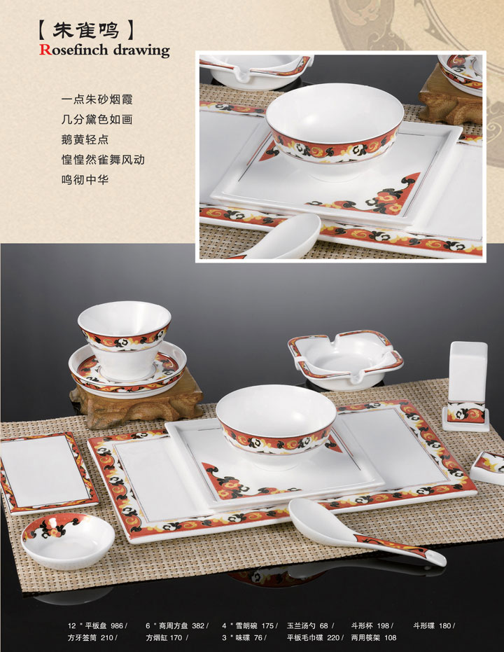 12寸平板盘、6寸商周方盘、4寸雪朗碗、玉兰汤勺、斗形杯、斗形碟、方牙签筒、方烟缸、3寸味碟、平板毛巾碟、两用筷架。