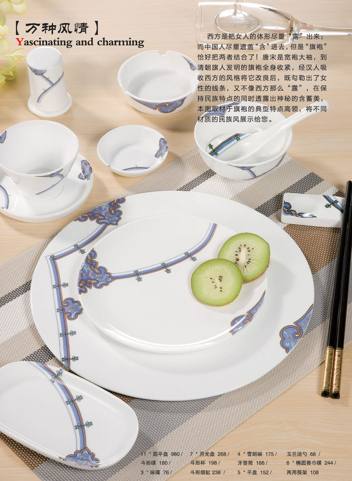 11寸圆平盘、7寸月光盘、4寸雪朗碗、玉兰汤勺、斗形碟、斗形杯、牙签筒、6寸椭圆香巾碟、3寸味碟、斗形烟缸、5寸平盘、两用筷架。