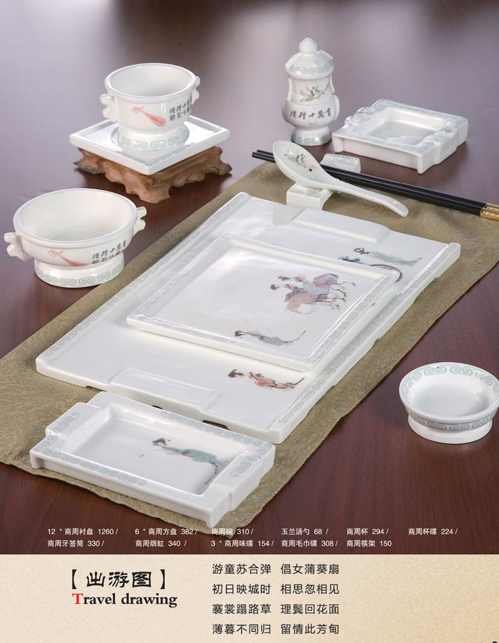 12寸商周衬盘、6寸商周方盘、商周碗、玉兰汤勺、商周杯、商周杯碟、商周牙签筒、商周烟缸、3寸商周味碟、商周毛巾碟、商周筷架。