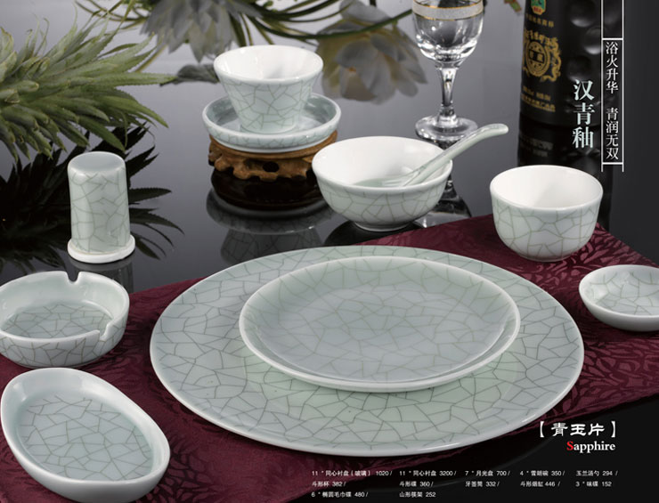 11寸同心衬盘(玻璃)、11寸同心衬盘、7寸月光盘、4寸雪朗碗、玉兰汤勺、斗形杯、斗形碟、牙签筒、斗形烟缸、3寸味碟、6寸椭圆毛巾碟、山形筷架。