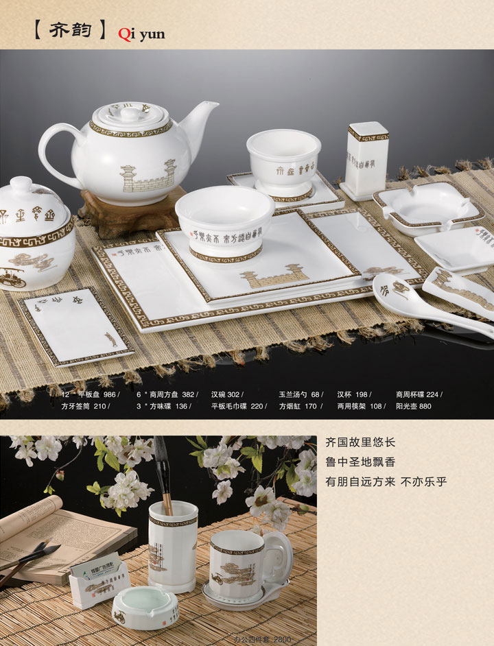 12寸平板盘、6寸商周方盘、汉碗、玉兰汤勺、汉杯、商周杯碟、方牙签筒、3寸方味碟、平板毛巾碟、方烟缸、两用筷架、阳光壶。
