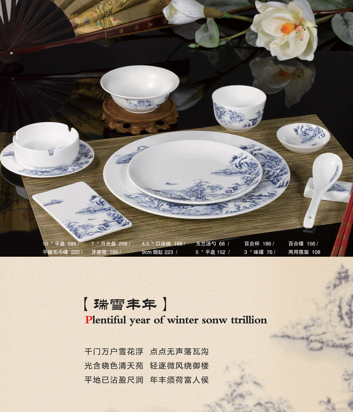 10寸平盘、7寸月光盘、4.5寸口汤碗、玉兰汤勺、百合杯、百合碟、平板毛巾碟、牙签筒、9cm烟缸、5寸平盘、3寸味碟、两用筷架。